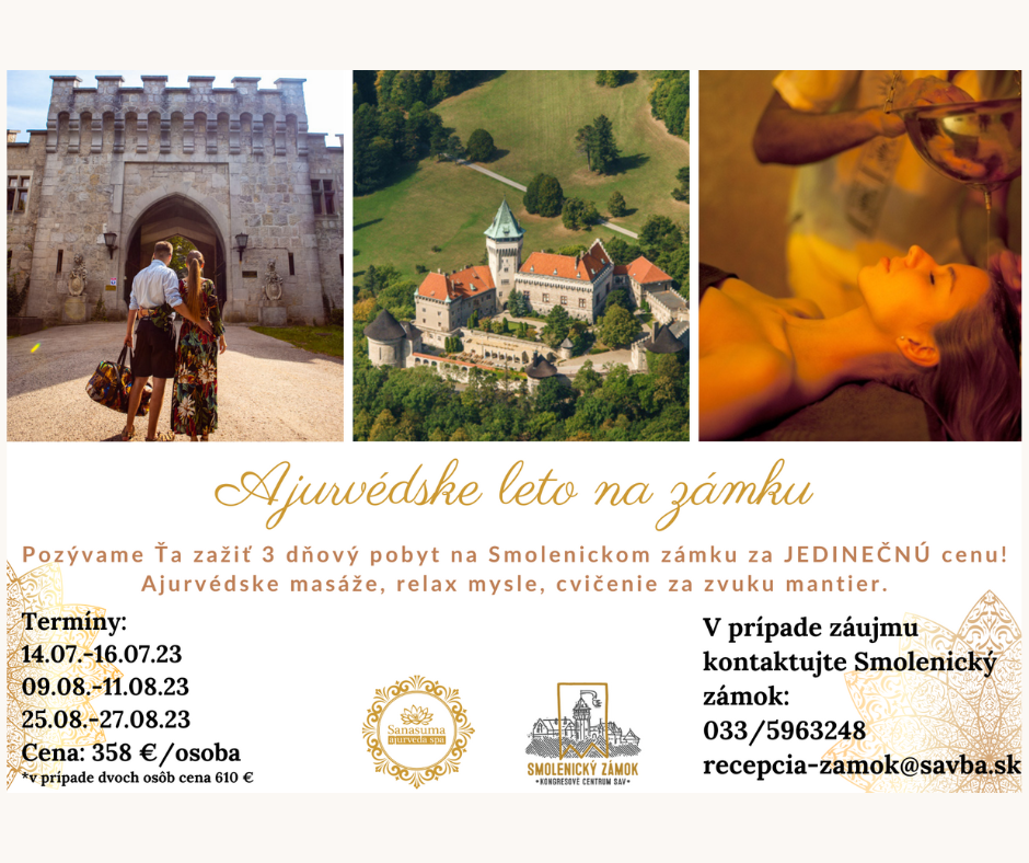 Počas 3 dní tu zažijete: – ajurvédsku masáž od úžasných Srílanských masérov – meditáciu vnútornej rovnováhy – raňajky v tráve v zámockom parku – cvičenie pri východe slnka v zámockej veži