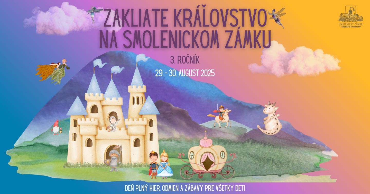 tešíme sa, že vás môžeme pozvať na tretí ročník rozprávkového podujatia Zakliate kráľovstvo na Smolenickom zámku, ktorý sa uskutoční 29.8. a 30.8. v čase od 10:00 do 18:00 v exteriérových ale aj interiérových priestoroch krásneho Smolenického zámku.